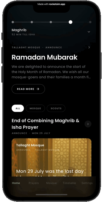 Community prayer app for Tallaght Mosque, Dublin. Real-time updates, push notifications, Arabic RTL.